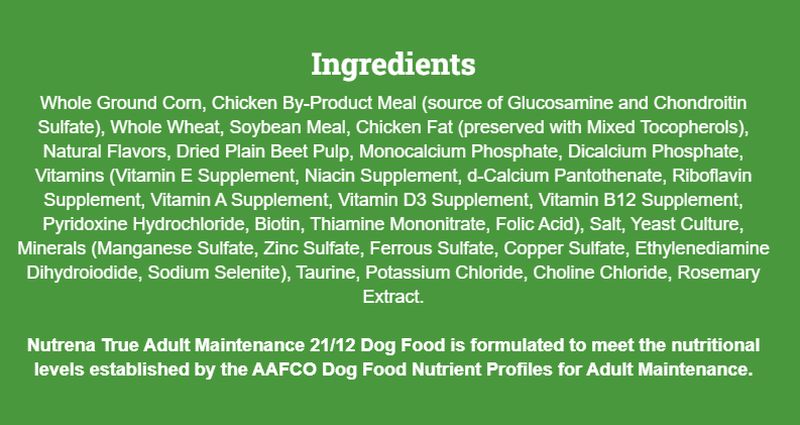 Nutrena True Adult Maintenance 21/12 Dog Food is specifically formulated to keep your moderately active dog looking and feeling their best with quality ingredients you can count on. For immune protection plus mobility and digestion support, each serving is powered with TruMune® power. And our patented Opti-Cook® process and added prebiotic deliver special digestive support with Omega 6 & 3 fatty acids supporting healthy skin and coat.