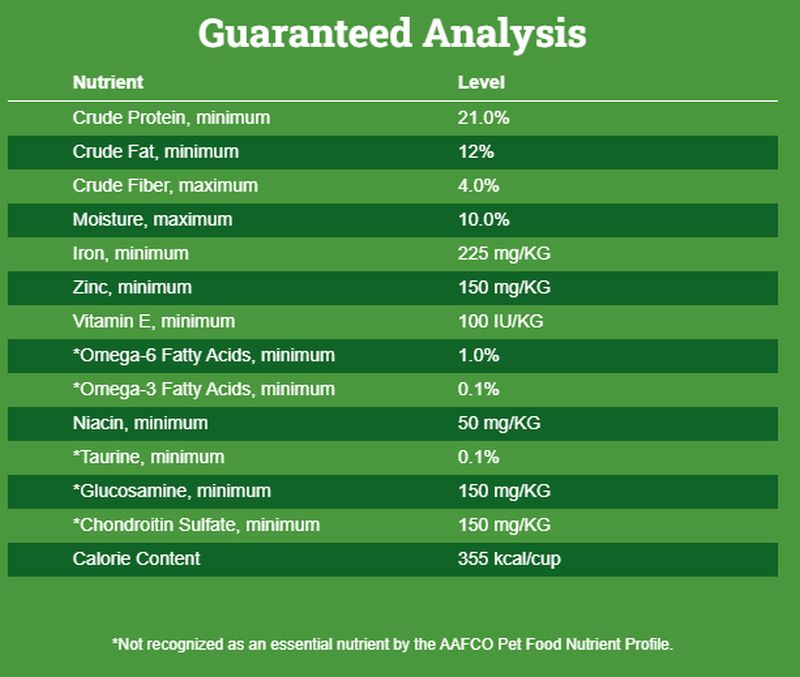 | Guaranteed Analysis | 21.0% Crude Protein; 12% Crude Fat (see image) |