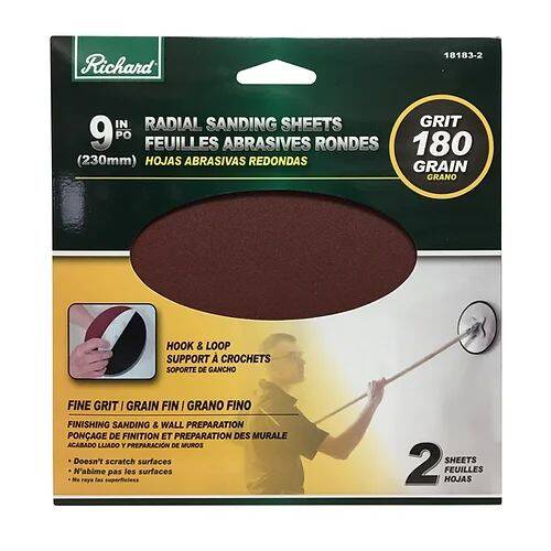 Richard® 9 inch, 180 Grit/Fine Grit, Radial Sanding Sheets- These round sheets have a hook and loop backing for fast paper changing on heavy-duty paper that resists tearing. They will not scratch wall surfaces, and make a perfect sanding finish without leaving any marks. Great for wall preparation before paint.