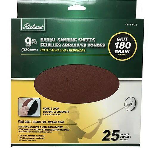 Richard® 9 inch, 180 Grit/Fine Grit, Radial Sanding Sheets- These round sheets have a hook and loop backing for fast paper changing on heavy-duty paper that resists tearing. They will not scratch wall surfaces, and make a perfect sanding finish without leaving any marks. Great for wall preparation before paint.
