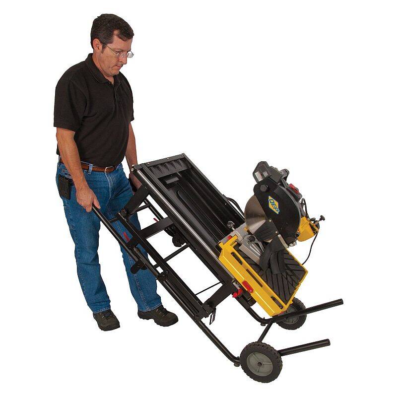 - Designed with a quick-release folding stand and oversized wheels making it easy to transport around the job site