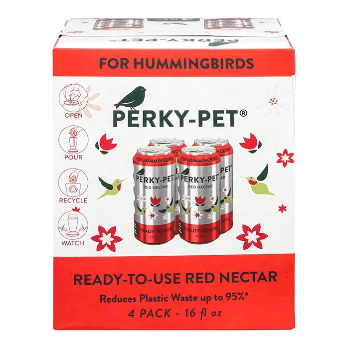Perky-Pet® Ready-to-Use Red Hummingbird Nectar nourishes and hydrates hummingbirds with a bird-friendly recipe that’s been reverse-engineered to mimic the real flower nectar they feed from in nature. It’s packaged in a lightweight, easy-to-use aluminum can and requires no boiling or mixing – just pop it open, pour the nectar into your feeder, and recycle the can. Hummingbirds will appreciate the beneficial food source, and hummingbird enthusiasts can put their feet up and enjoy watching the dazzling birds buzzing about and dining at the feeder.