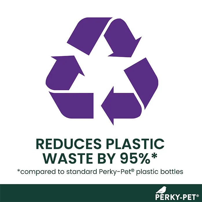 - Aluminum can design reduces plastic waste by 95% compared to standard Perky-Pet plastic bottles