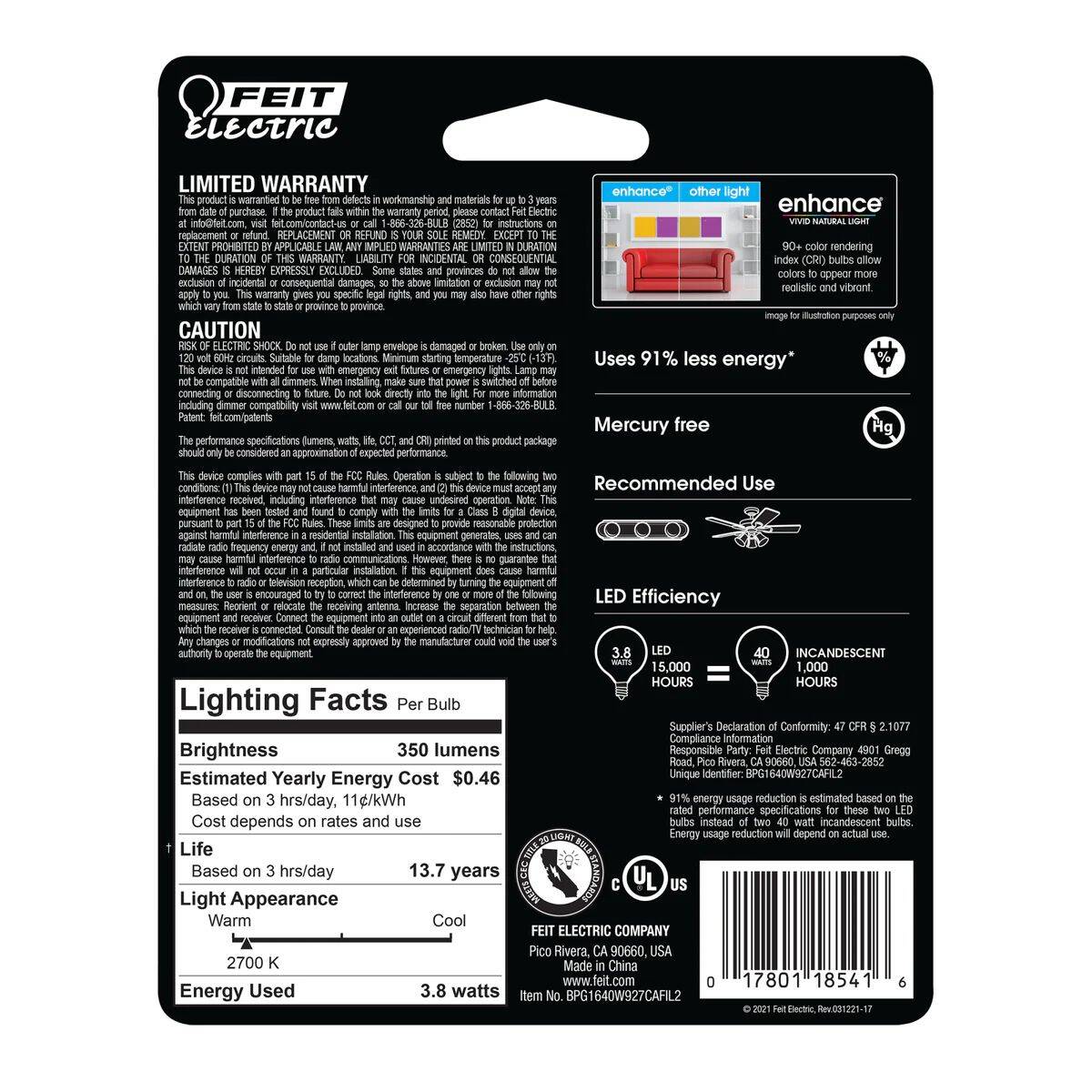 Combine the vintage glass filament lighting look and feel with the advantages of modern LED technology with these stylish light bulbs from Feit Electric. Energy-efficient LEDs replace a 40-watt incandescent, producing a 2700K Soft White glow that gives the home a cozy feel. A frosted G16 1/2 mini-globe design with exposed filament wrapped in frosted glass housing is ideal for chandelier fixtures and will enhance the décor of any room. Enhance 90+ CRI light makes colors vibrant and skin tones more natural, all while saving energy and lasting for decades.