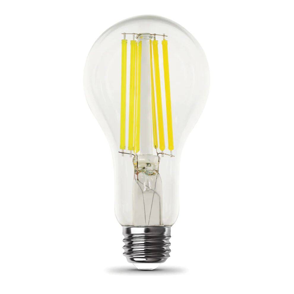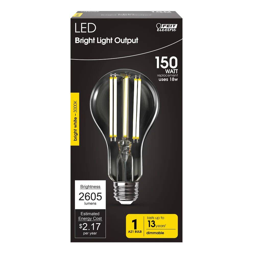 Enjoy all the benefits of advanced LED energy-saving technology with a decorative A-shape LED light bulb from Feit Electric. Replacing a 150-watt incandescent light, this ultra-bright bulb produces 2605 lumens of 3000K Bright White light while using just 18 watts of electricity - saving up to 88% in energy costs. A stylish design with clear glass and an exposed filament instantly livens up the décor of any room. These fully dimmable filament LED bulbs have an average life of 15,000 hours/13 years, are RoHS compliant, and are 100% mercury free. Choose a dependable decorative bulb to brighten your home.