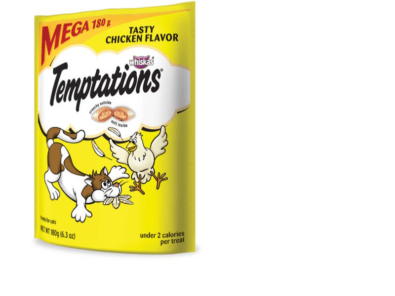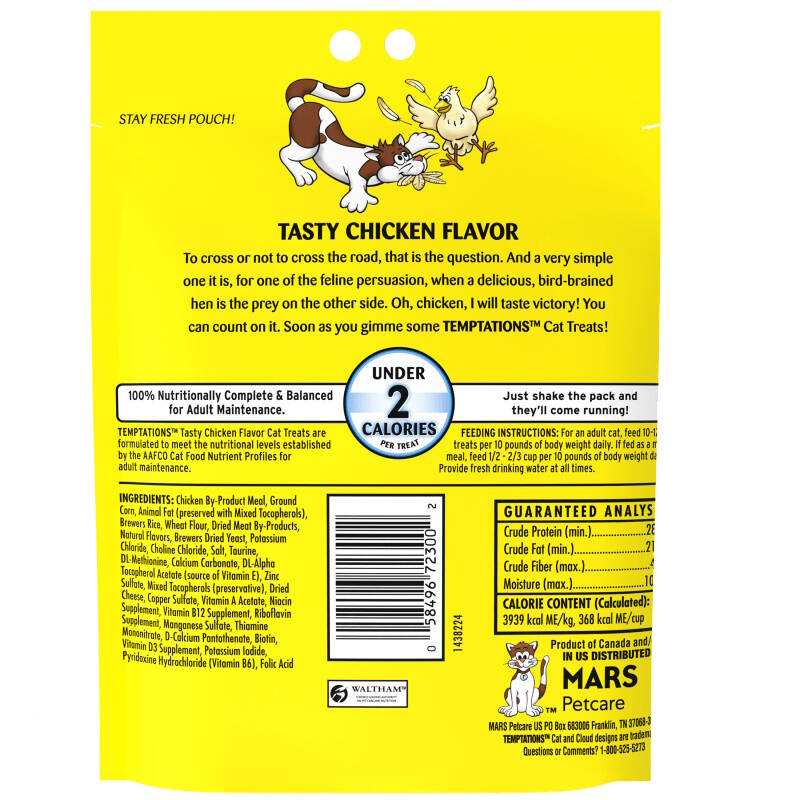 Cats can’t resist the delectable taste of TEMPTATIONS, so give your cat these purrfect TEMPTATIONS Classic Cat Treats… they’ll come running the moment you open the pouch. Each of these low calorie chicken flavor cat snacks has less than 2 calories and provides an irresistible combination of both crunchy and soft textures. These healthy cat treats also come in a cat-proof, stay-fresh pouch, so your feline friend can enjoy their favorite snack when you open it, but never when they shouldn’t! These TEMPTATIONS Classic Cat Treats are a perfect addition to your cat’s normal feeding routine: Use them as a treat, a meal, or a cat food topper. They also are the perfect size treats for cat toys... try mixing up playtime by placing a few inside a treat dispensing toy and watch your cat chase and swat away.