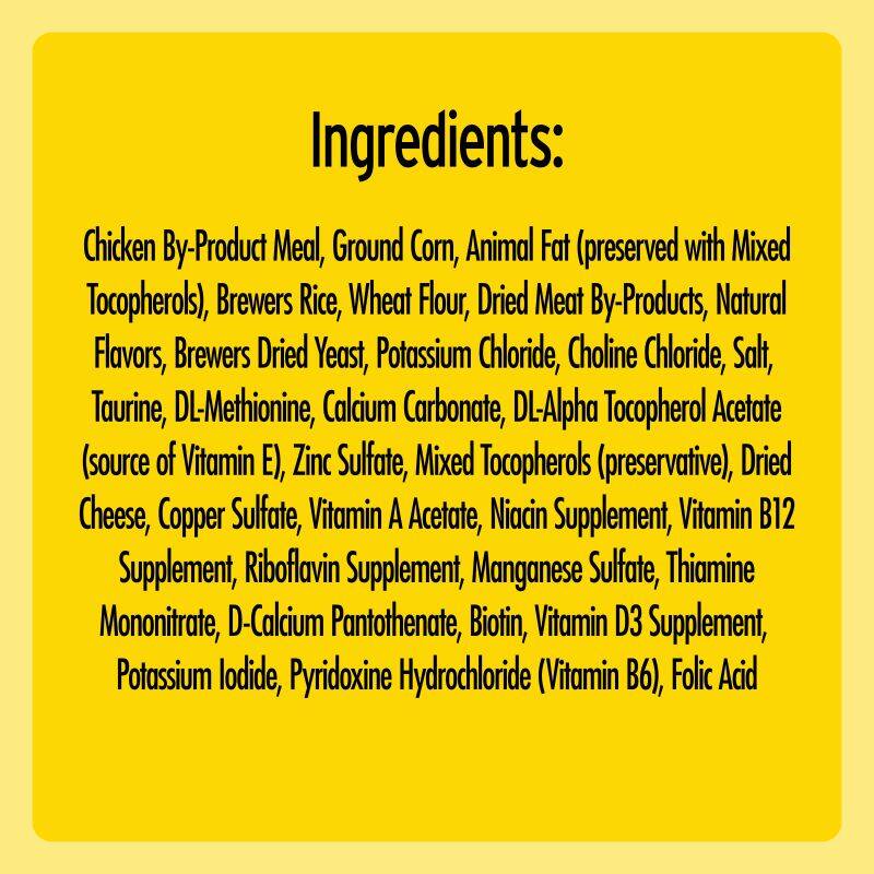 | Ingredients | Chicken By-Product Meal, Ground Corn, Animal Fat (preserved with Mixed Tocopherols), Brewers Rice, Wheat Flour, Dried Meat By-Products, Natural Flavors, Brewers Dried Yeast, Potassium Chloride, Choline Chloride, Salt, Taurine, DL-Methionine, Calcium Carbonate, DL-Alpha Tocopherol Acetate (source of Vitamin E), Zinc Sulfate, Mixed Tocopherols (preservative), Dried Cheese, Copper Sulfate, Vitamin A Acetate, Niacin Supplement, Vitamin B12 Supplement, Riboflavin Supplement, Manganese Sulfate, Thiamine Mononitrate, D-Calcium Pantothenate, Biotin, Vitamin D3 Supplement, Potassium Iodide, Pyridoxine Hydrochloride (Vitamin B6), Folic Acid |