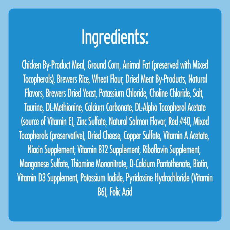 | Ingredients | Chicken By-Product Meal, Ground Corn, Animal Fat (preserved with Mixed Tocopherols), Brewers Rice, Wheat Flour, Dried Meat By-Products, Natural Flavors, Brewers Dried Yeast, Potassium Chloride, Choline Chloride, Salt, Taurine, DL-Methionine, Calcium Carbonate, DL-Alpha Tocopherol Acetate (source of Vitamin E), Zinc Sulfate, Natural Salmon Flavor, Red #40, Mixed Tocopherols (preservative), Dried Cheese, Copper Sulfate, Vitamin A Acetate, Niacin Supplement, Vitamin B12 Supplement, Riboflavin Supplement, Manganese Sulfate, Thiamine Mononitrate, D-Calcium Pantothenate, Biotin, Vitamin D3 Supplement, Potassium Iodide, Pyridoxine Hydrochloride (Vitamin B6), Folic Acid |