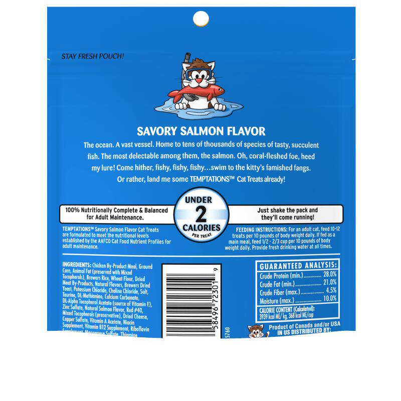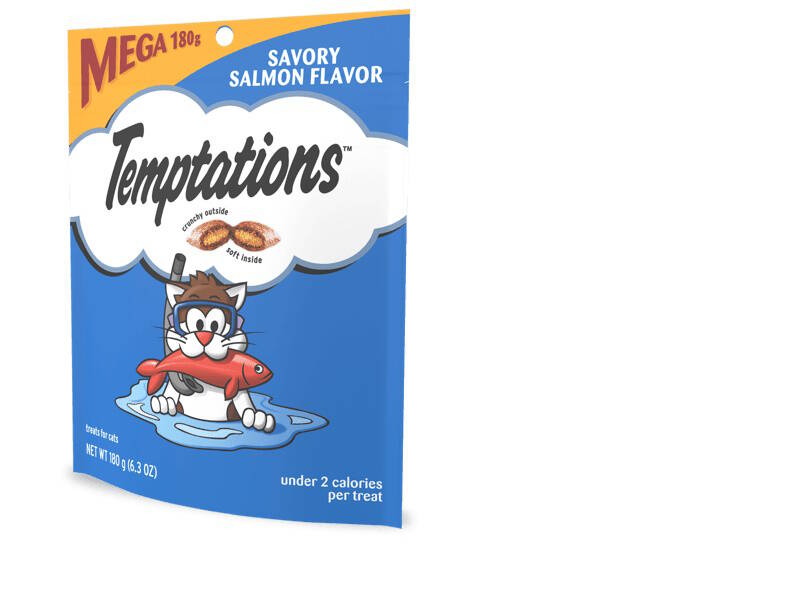 - Contains one (1) 3 oz. pouch of TEMPTATIONS Classic Cat Treats Savory Salmon Flavor