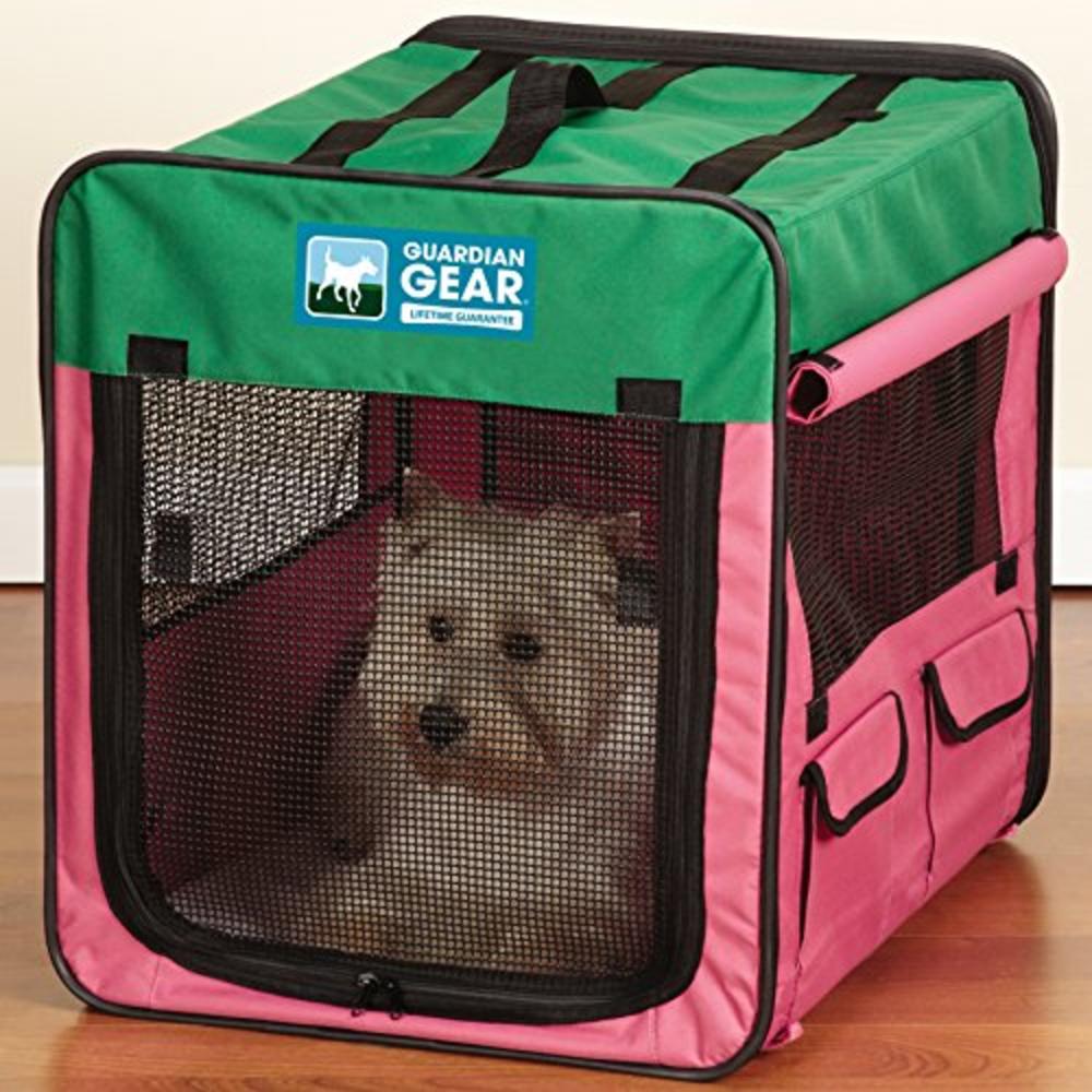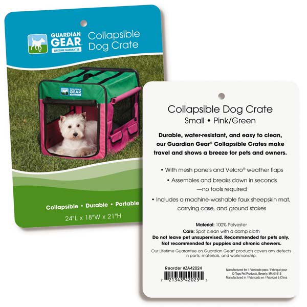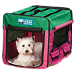 This small, pink and green collapsible pet crate from GEAR offers a quick, comfortable shelter for travel, vet visits, or everyday naps. It is made from 100% polyester and features mesh panels for ventilation and VELCRO weather flaps to help shield your pet from wind or light rain. The crate measures 24 inches long, 18 inches wide and 21 inches high, and assembles or breaks down in seconds with no tools required for easy setup wherever you go. It comes complete with a machine-washable faux sheepskin mat for cushioned comfort, a carrying case for transport, and ground stakes to secure the crate outdoors. Constructed for convenience and comfort, this lightweight, foldable design keeps pets cozy and contained at home or on the go. Country of origin: China.
