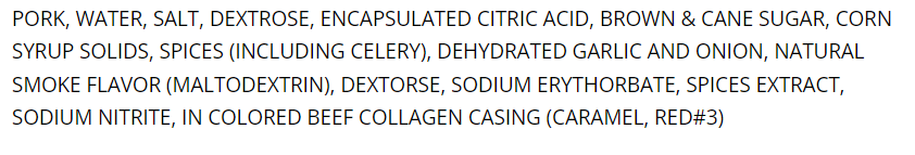 Ingredients Pork, Water, Salt, Dextrose, Encapsulated Citric Acid, Brown & Cane Sugar, Corn Syrup Solids, Spices (including celery), Dehydrated Garlic and Onion, Natural Smoke Flavor (Maltodextrin), Dextrose, Sodium Erythorbate, Spices Extract, Sodium Nitrate, in Colored Beef Collagen Casing (Caramel, Red#3)