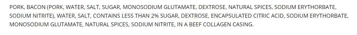Ingredients Pork, Bacon (Pork, Water, Salt, Sugar, Monosodium Glutamate, Dextrose, Natural Spices, Sodium Erythorbate, Sodium Nitrite), Water, Salt, Contains Less Than 2% Sugar, Dextrose, Encapsulated Citric Acid, Sodium Erythorbate, Monosodium Glutamate