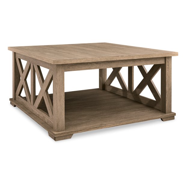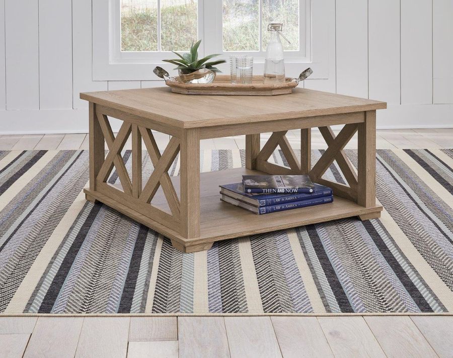 Open the door to modern farmhouse style with the classic Elmferd square coffee table that features a light natural oak wood grain pattern. The open crossbuck side panel detail and spacious lower shelf add even more rustic appeal.