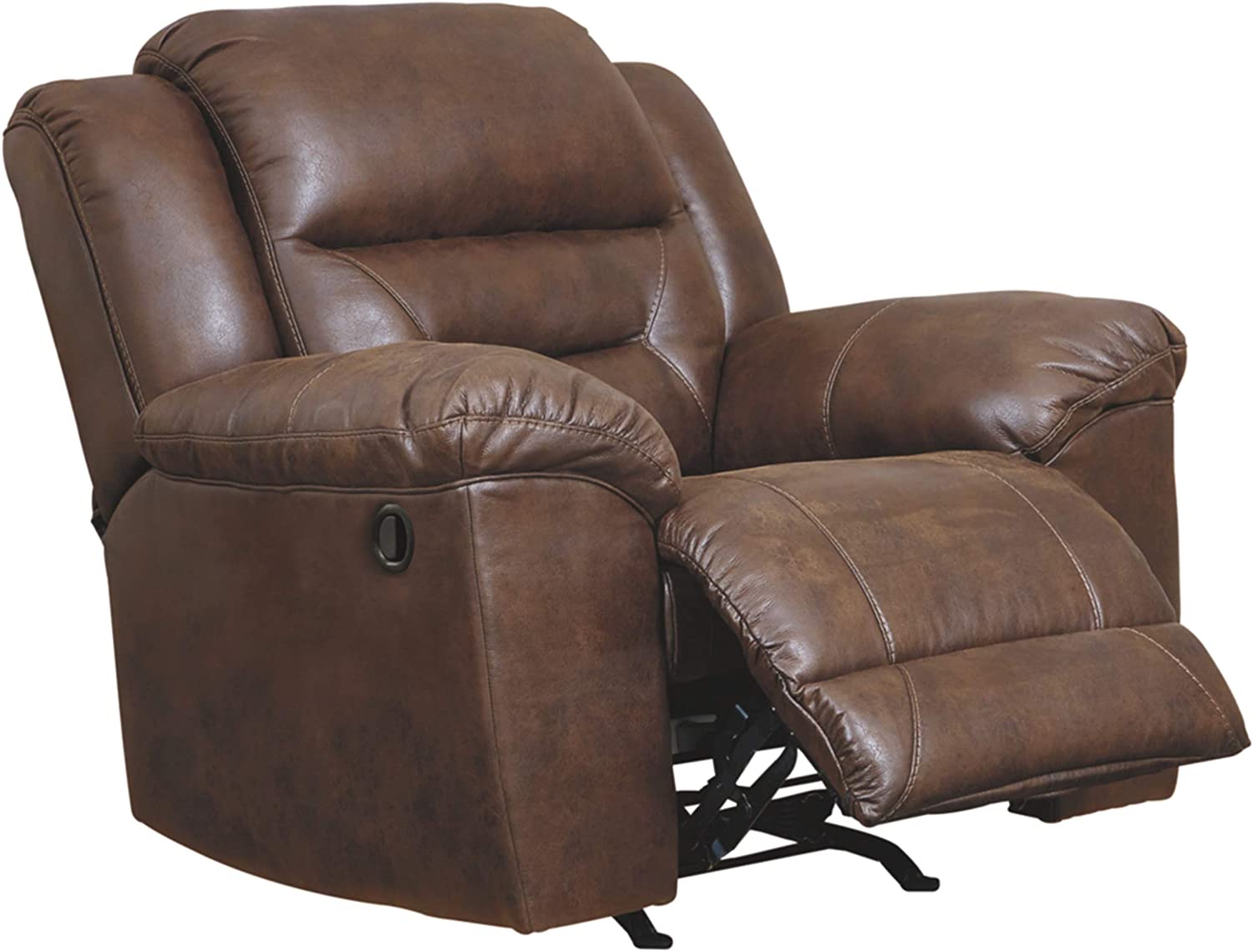 For those that love the cool look of leather but long for the warm feel of fabric, the Stoneland rocker recliner delivers both with ease. Its high-performance padded faux leather is remarkably durable and easy to clean, just the thing for family spaces. Channel-stitched back cushions provide indulgent lumbar support for maximum comfort—not to mention fashion-forward flair.