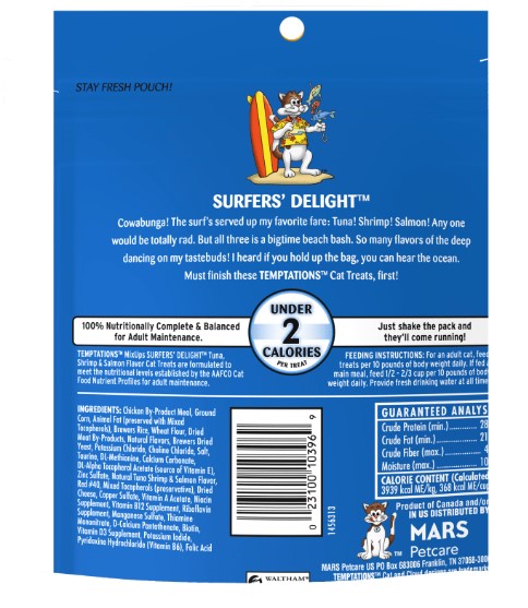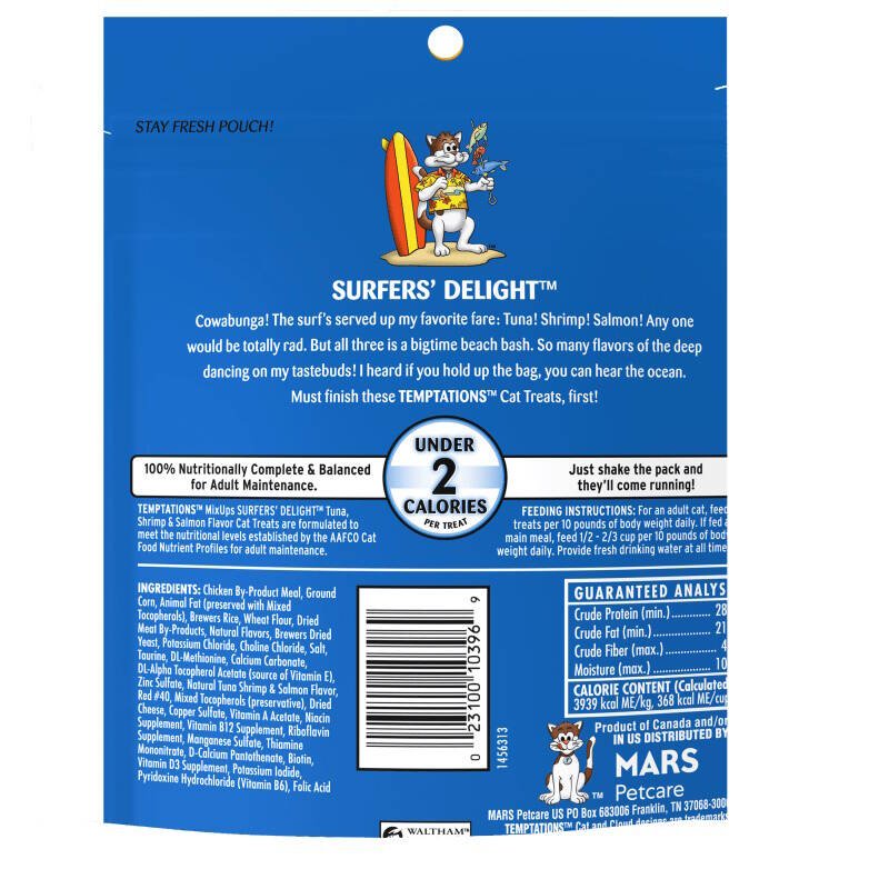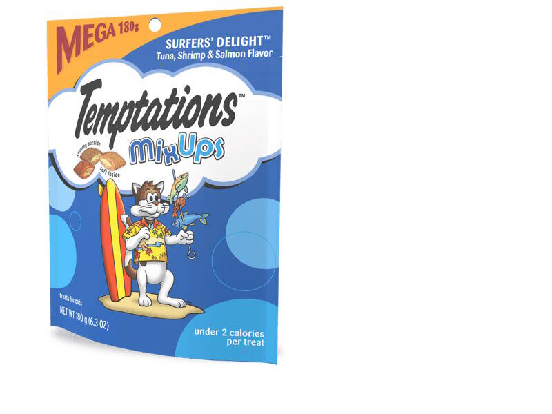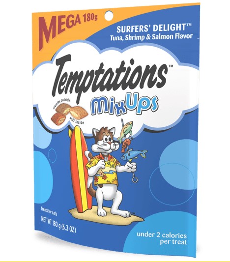 - Contains one (1) 6.3 oz. pouch of TEMPTATIONS MixUps Cat Treats Surfers’ Delight, including three of your cat’s favorite flavors: tuna flavor, shrimp flavor, and seafood flavor
