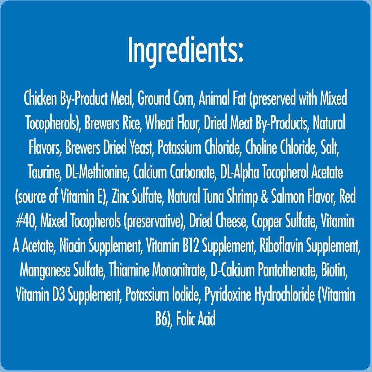 | Ingredients | Chicken By-Product Meal, Ground Corn, Animal Fat (preserved with Mixed Tocopherols), Brewers Rice, Wheat Flour, Dried Meat By-Products, Natural Flavors, Brewers Dried Yeast, Potassium Chloride, Choline Chloride, Salt, Taurine, DL-Methionine, Calcium Carbonate, DL-Alpha Tocopherol Acetate (source of Vitamin E), Zinc Sulfate, Natural Tuna Shrimp & Salmon Flavor, Red #40, Mixed Tocopherols (preservative), Dried Cheese, Copper Sulfate, Vitamin A Acetate, Niacin Supplement, Vitamin B12 Supplement, Riboflavin Supplement, Manganese Sulfate, Thiamine Mononitrate, D-Calcium Pantothenate, Biotin, Vitamin D3 Supplement, Potassium Iodide, Pyridoxine Hydrochloride (Vitamin B6) |