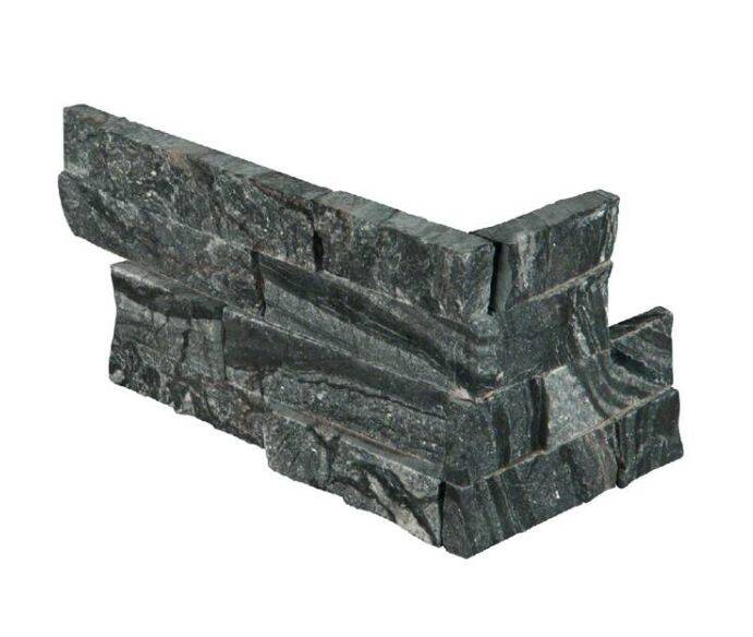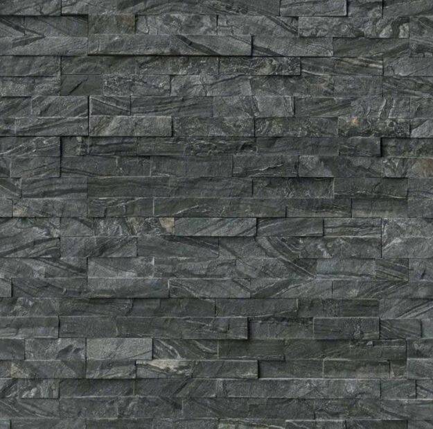 Glacial Black Stacked Stone panels are crafted from split face natural marble. The deep charcoal tones are highlighted by soft white veins, inherent in this beautiful marble. Suitable for a variety of interior and exterior design features including accent walls, shower and tub surrounds, exterior cladding, and to wrap architectural features like columns. Matching corners are available to finish off projects.