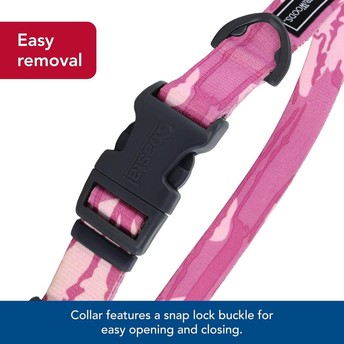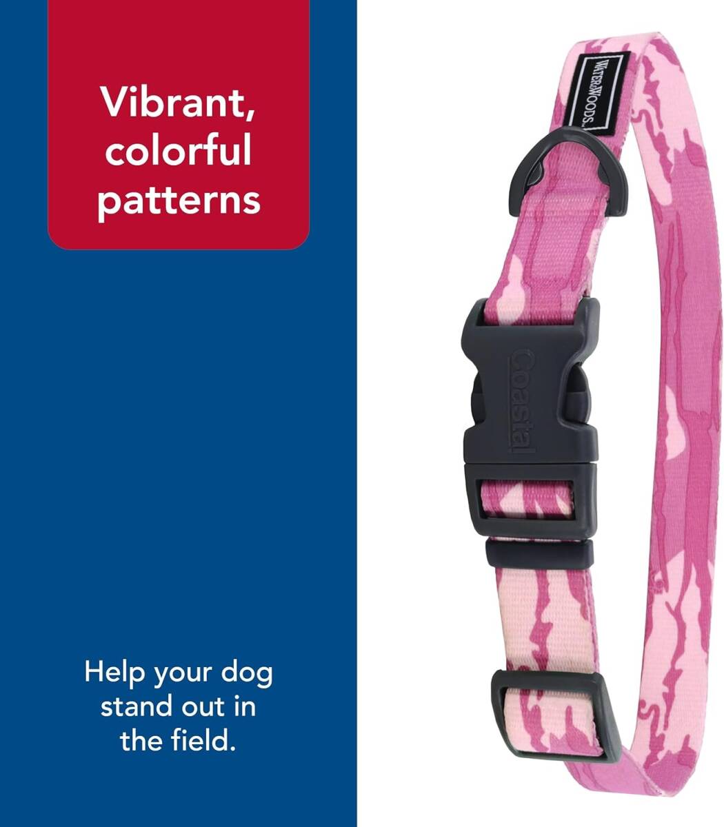 The Water & Woods Adjustable Dog Collar, meticulously crafted with top-quality materials, is the ultimate collar for dog. Built to endure intense play, its vibrant pattern remains vivid and eye-catching due to colorfast material that resists sun exposure and other elements, preventing fading over time. A notable aspect of this patterned dog collar's design is the innovative curved snap-lock buckle. This feature ensures a comfortable, secure fit around your dog's neck, particularly important during movement. With adjustability to accommodate various neck sizes, this collar offers a customized fit for dogs of any size or breed. Founded in Ohio in 1968, Coastal Pet is committed to producing and delivering quality products that people trust for the pets they love. Coastal Pet is also a huge part of establishing industry standards for product safety, strength, and durability throughout the years. We make products for dogs and cats of every size, shape, and lifestyle. We've got the collars, leashes, harnesses, and toys that keep them smiling. We also offer products for grooming, traveling, and feeding your pets through brands like Bergen and Safari by Coastal.
