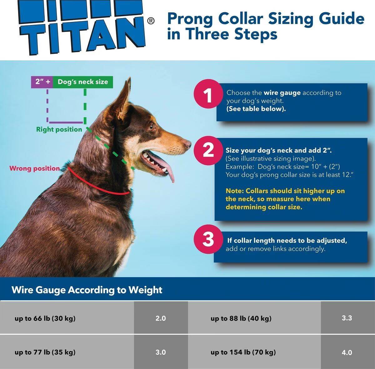 The Titan Training Prong Collar is electric welded and chrome plated for maximum strength and durability. It will not tarnish, rust or break. Featuring a link closure style, prong links unfasten for easy collar placement and removal. Extra links and vinyl comfort tips are available.Chain training prong collars are safe, effective training tools with proper use. They are not to be used for tie out.