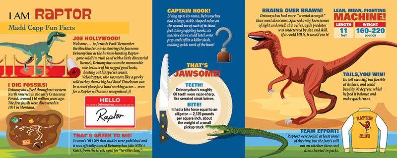 Each puzzle comes with an educational Madd Capp Fun Facts insert. On one side is a fold-out puzzle image to hang as a poster or use as a reference. On the flipside is a wealth of amazing facts. Did you know, for instance, that deinonychus had a large sickle-shaped talon on the second toe of each of its hind feet? Like grappling hooks, its massive claws could latch onto prey and inflict a killer slash, making quick work of the hunt!