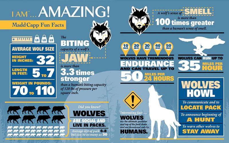 Each puzzle comes with an educational Madd Capp Fun Facts booklet. On one side is a fold-out puzzle image to hang as a poster or use as a reference. On the flipside is a wealth of amazing facts. Did you know, for instance, that a wolf's sense of smell is more than 100 times greater than a human's sense of smell?