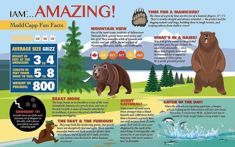 Each puzzle comes with an educational Madd Capp Fun Facts booklet. On one side is a fold-out puzzle image to hang as a poster or use as a reference. On the flipside is a wealth of amazing facts. Did you know, for instance, that when the salmon are migrating upstream, a hungry grizzly bulking up for hibernation will eat a few dozen fish each day? It can devour 90 lbs. of food each day to double its body weight before a long winter's nap.