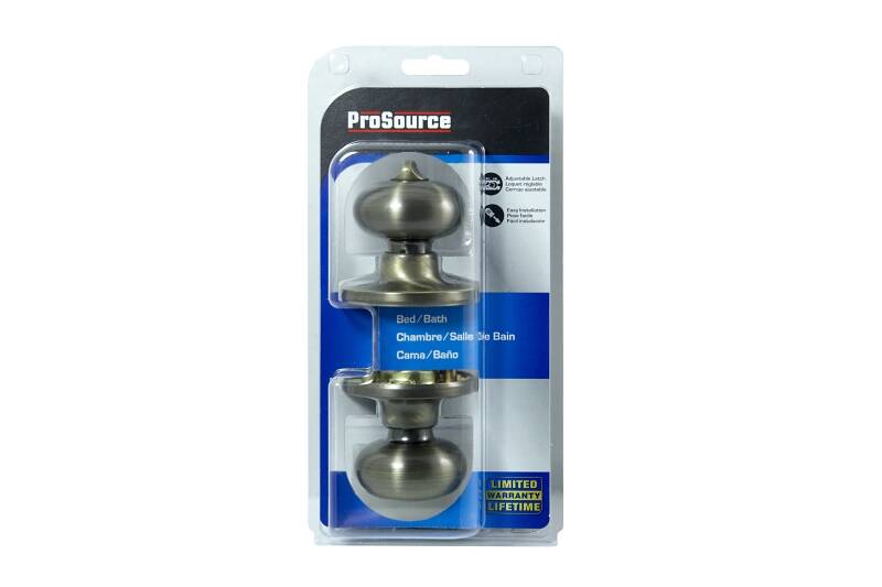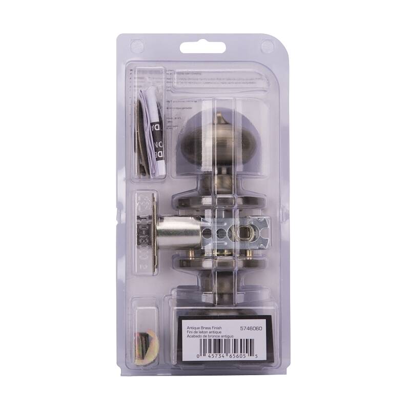 For bedroom or bathroom doors. Both knobs lock or unlock by turnbutton inside, or emergency key outside. All metal components. Solid steel latch assembly. Seamless one-piece knob for extra strength. Easy installation. Square spindle for right or left handed installations. 6-way adjustable latch fits 2-3/8" to 2-3/4" square corner, radius corner, or drive-in applications; includes both square and 1/4" radius corner strikes. TUBULAR - TF BARON SERIES VISUAL PACK 6-Way Adjustable Latch Finish=Antique Brass