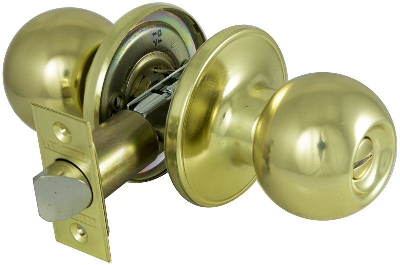 For bedroom or bathroom doors. Both knobs lock or unlock by turn button inside, or emergency key outside. All metal components. Solid steel latch assembly. Seamless one-piece knob for extra strength. Easy installation. Square spindle for right or left handed installations. 6-way adjustable latch fits 2-3/8" to 2-3/4" square corner, radius corner, or drive-in applications; includes both square and 1/4" radius corner strikes.