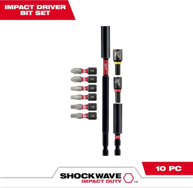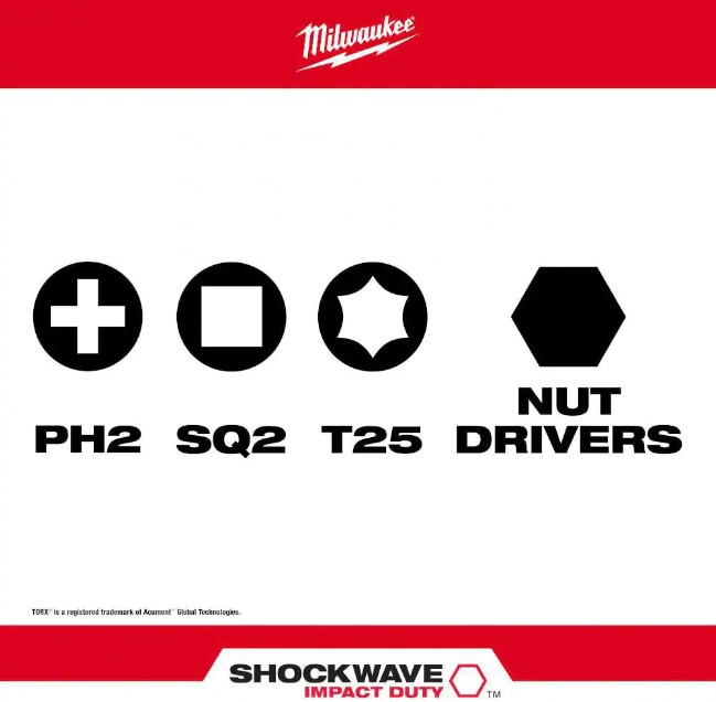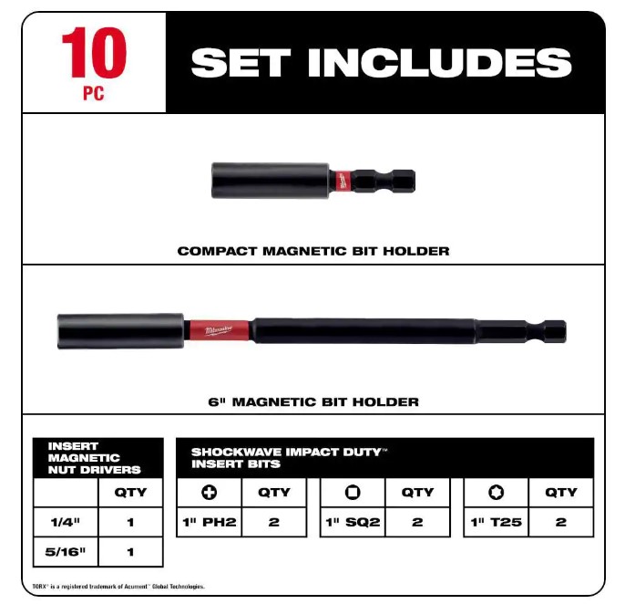 | Includes | (1) Compact Magnetic Bit Holder, (1) Impact Magnetic Bit Holder, (3) Phillips Bit 2" P2, (2) Square Bit 2" SQ2, (2) Torx Bit 2" T25, (1) 1/4" Magnetic Nut Driver, (1) 5/16 Magnetic Nut Driver |