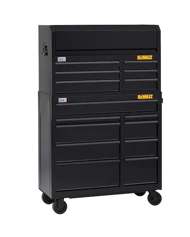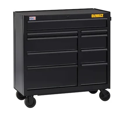 This 41-inch wide 9-Drawer Rolling Tool Cabinet is constructed of double-wall steel for strength and durability. It has nine 100-pound load capacity drawers with soft close latching for smooth and quiet operation. It also has a heavy-duty keyed internal locking system to safeguard tools. This cabinet has a load rating of 1,500 pounds with reinforced mounting channels, and it has four 5-inch x 2-inch casters, two of which lock and swivel. A full-grip tubular side handle with a comfortable black overmold is included for ease of mobility. Also included are nine DEWALT embossed drawer liners and one DEWALT embossed top mat to help protect the cabinet surface.