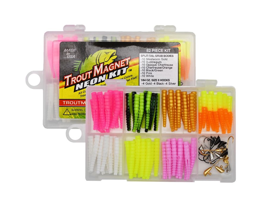 The Trout Magnet Neon Kit is a collection of the 7 hottest colors. Perfect in almost every fishing condition, these colors are bright, popular, and deadly. The Neon Kit comes with (10) of the following body colors: mealworm gold, bubble gum, opaque chartreuse, chartreuse/orange, green/black, pink, and white. The kit also includes (4) gold, (4) black, and (4) silver 1/64oz shad-dart heads.