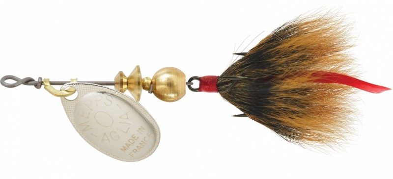 Mepps dressed Aglia spinners come in sizes #00 through #5. A #00 is a Mepps Ultra Lite and it weighs only 1/18 oz. These little trout and panfish lures are dressed with natural hackle. They are also available as wooly worms. The #0 Aglia Spin Fly is also a Wooly Worm. It too is perfect for both panfish and trout and weighs 1/12 oz. Larger dressed Aglias weigh up to 1/2 oz. (#5). The hooks on dressed Aglias in sizes #1-#5 are dressed with natural squirrel tail or bucktail.