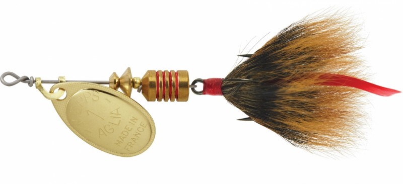 Mepps dressed Aglia spinners come in sizes #00 through #5. A #00 is a Mepps Ultra Lite and it weighs only 1/18 oz. These little trout and panfish lures are dressed with natural hackle. They are also available as wooly worms. The #0 Aglia Spin Fly is also a Wooly Worm. It too is perfect for both panfish and trout and weighs 1/12 oz. Larger dressed Aglias weigh up to 1/2 oz. (#5). The hooks on dressed Aglias in sizes #1-#5 are dressed with natural squirrel tail or bucktail.