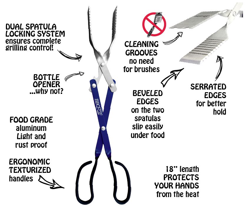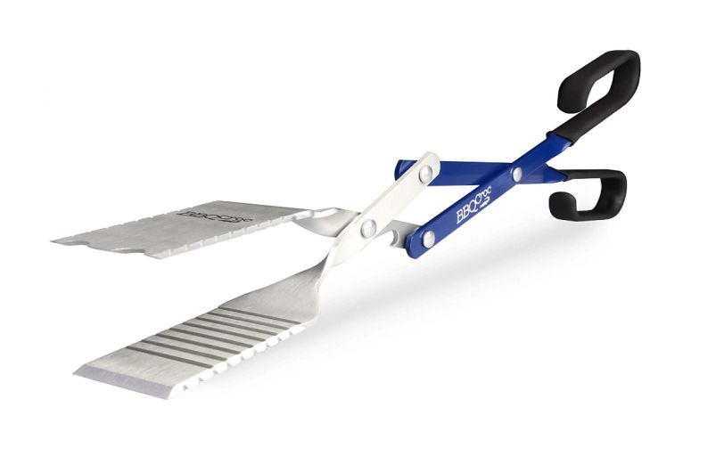 - Its clever design allows this tool to be used as tongs or as a spatula. It can then be flipped over to scrape your grill clean.