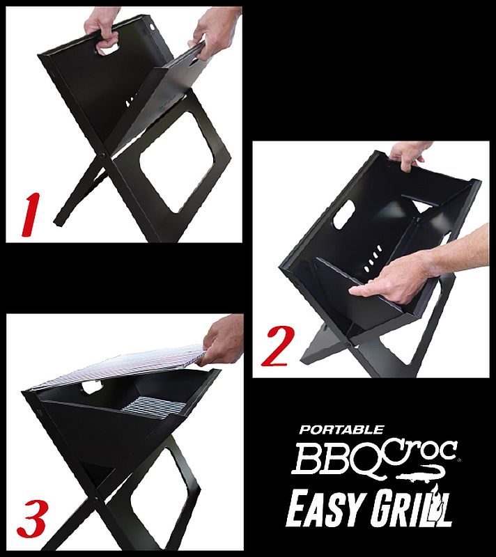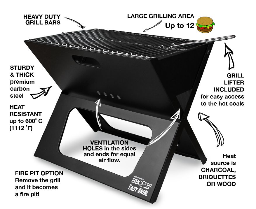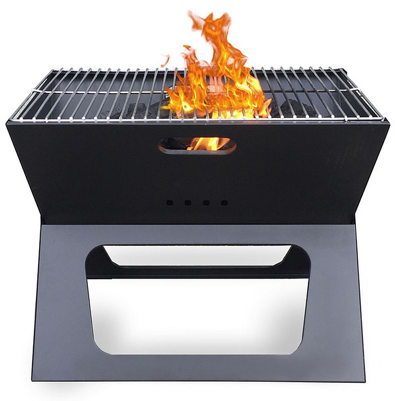 Portable barbecuing made EASY. This innovative portable charcoal BBQ is the most compact on the market. Folded, it has a width of only 1-1/4-inches and carries just like a briefcase, making it perfect for traveling! As a heat source, this grill will accept briquettes, charcoal and wood pieces of all types. Transforms into a Fire pit when the upper grill is removed.