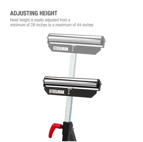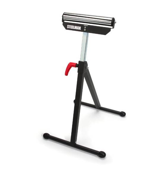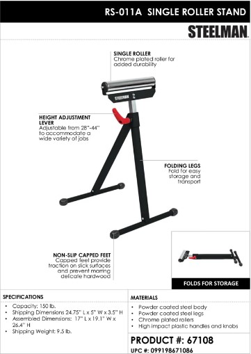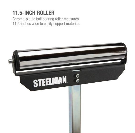 With the STEELMAN RS-011A (67108) 11.5-Inch Wide Adjustable Single Roller Material Support Stand, you’ll always be a smooth operator on the job. Featuring a 150 lb. capacity, this sturdy powder-coated steel single roller stand features a chrome ball-bearing roller that allows material to glide over smoothly. It’s ideal when guidance and control are needed to support and keep long materials, such as wood or pipes, steady and level. It also provides an added level of safety as it supports materials for saws and prevents cut material falling and possibly swinging or bouncing back into the path of spinning blades. The height is fully adjustable thanks to an easy-lock lever with a minimum height of 28-inches and a maximum of 44-inches, and can be quickly folded up flat for compact storage and transport.