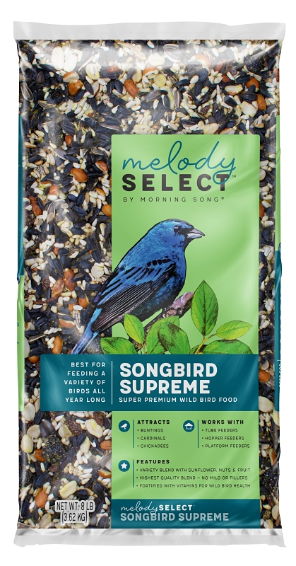 Melody Select songbird supreme wild bird food is a blend of select seeds, nuts and fruit to keep songbirds singing all year long. Boasting a rich array of ingredients, including sunflower seeds and chips, safflower seeds, peanuts, sun-dried raisins and sweet cherries, this blend offers an excellent source of healthy fat, protein and carbohydrates for well-rounded nutrition.