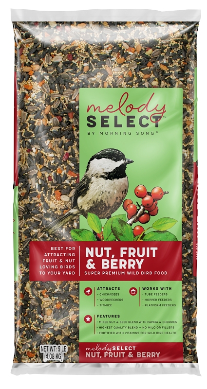 Melody Select nut, fruit and berry wild bird food is brimming with seeds, nuts and 100% real fruit to attract a variety of nut and fruit-loving birds to your feeders. This sweet and savory blend of chunky treats features protein-rich peanuts, mixed nuts and sunflower seeds loaded with healthy fat, plus high-energy raisins, papaya and cherries.