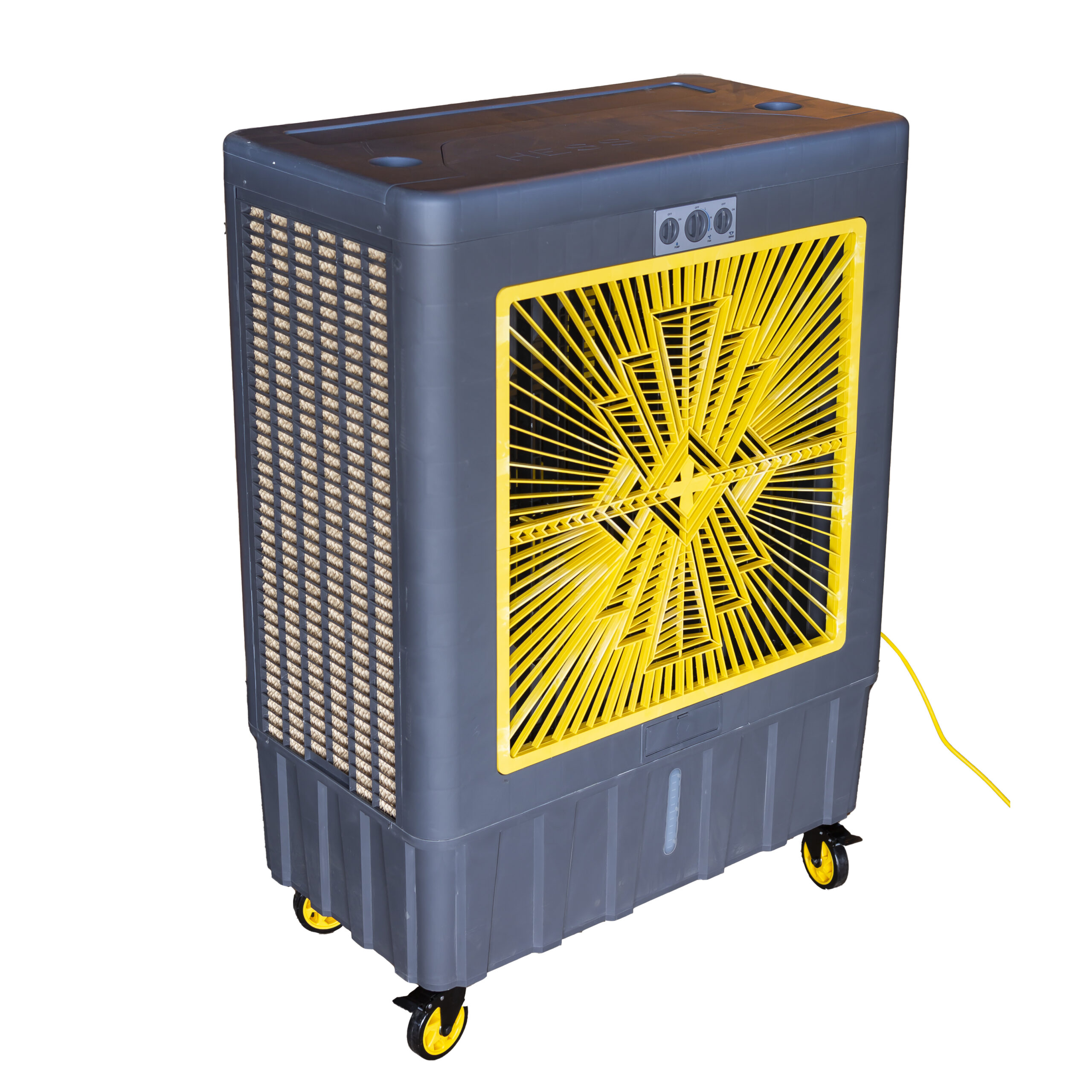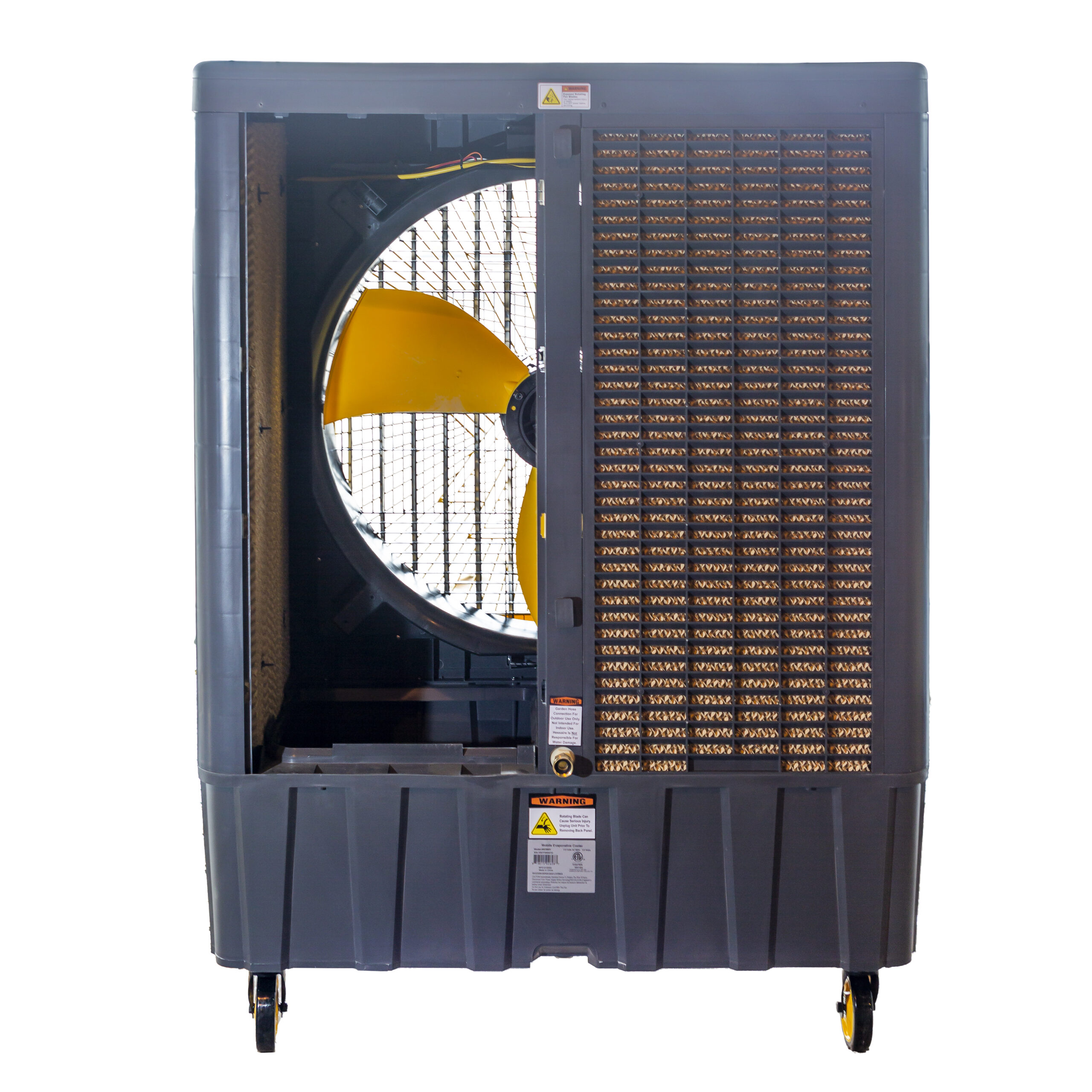 The Hessaire 11,000 CFM Evaporative Cooler is compact in size, pleasing in aesthetics and the performance exceeds coolers of a much larger size. This performance is achieved through expanding air-intake areas to the hi-density XeL50 rigid media. These coolers have 3 media panels instead of a single panel found on most mobile coolers. 3 panels allow more air-intake area and reduce pre-rotation of the air to the prop, which translates into lower static pressure and more efficient air delivery to the prop. The hi-density XeL50 media provides 80% more evaporation surface compared to regular density media. This means higher evaporation efficiency and cooler temperatures.