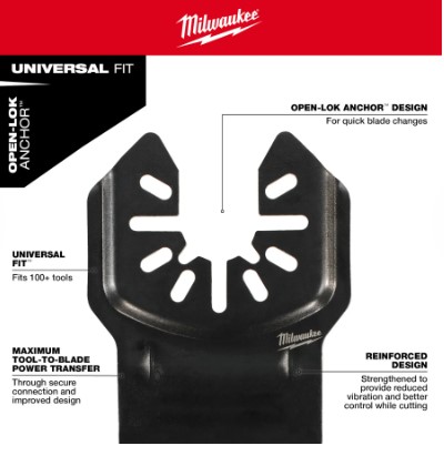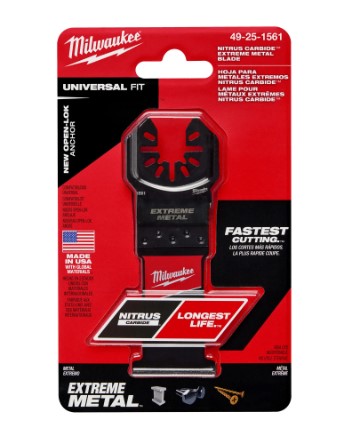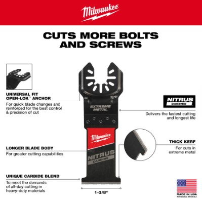 Our NITRUS CARBIDE™ Extreme Metal Universal Fit OPEN-LOK™ Oscillating Multi-Tool Blades provide the ultimate cutting experience, delivering the fastest cutting and longest life on the jobsite. The extreme metal NITRUS CARBIDE™ multi-tool blade delivers up to 2X more cuts than Carbide Teeth blades - capable of hundreds of cuts in deck screws. The extreme metal blade is ideal for cutting metal fasteners such as bolts, screws, nails, and threaded rods. The new Universal Fit OPEN-LOK™ Anchor is reinforced for added strength and control and allows for quick blade changes across 100+ multi-tools. Not compatible with Starlock tools. MILWAUKEE® oscillating multi-tool blades are designed and made in the USA with global materials.