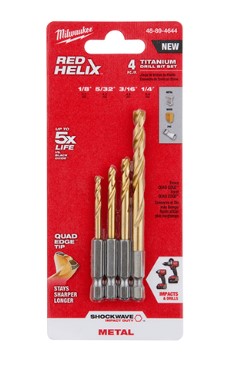 Our SHOCKWAVE™ RED HELIX™ Titanium Drill Bits are engineered for extreme durability and long life. The QUAD EDGE™ tip delivers a precision start and four cutting edges to create smaller chips for faster removal and less heat for longer bit life. The Variable Helix ™ design includes an aggressive 35° helical angle, which ends at 15°, these titanium drill bits with RED HELIX™ provide Rapid Chip Removal™ limiting heat buildup to Stay Sharper Longer™. The bits also feature an internal ENHANCED TAPERED WEB that greatly increases their strength, reducing premature breakage. Our titanium drill bits are ideal for various applications, including but not limited to wood, plastics, and metals. MILWAUKEE® Red Helix Titanium Drill Bits provide up to 5X life vs. black oxide drill bits.