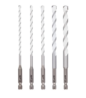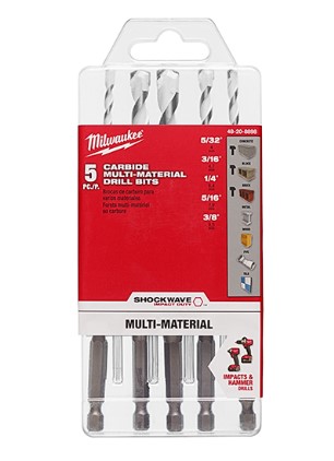 5-Piece SHOCKWAVE™ Carbide Multi-Material Drill Bits are the most versatile bits, designed to tackle materials such as brick, block, concrete, steel, aluminum, ceramic tile, backerboard, wood, PVC, and drywall. The aggressive multi-grind carbide tip delivers up to 10x longer life in stacked materials and up to 85% faster drilling speeds in metal. Equipped with a 1/4" hex shank, these general-purpose bits are compatible with impacts, drill/drivers, and hammer drills. MILWAUKEE® SHOCKWAVE™ Multi-Material Drill Bits provides the ideal all-in-one solution for the widest variety of materials, tools, and applications. This kit incudes (1) 5/32", (1) 3/16", (1) 1/4", (1) 5/16", and (1) 3/8" SHOCKWAVE™ Carbide Multi-Material Drill Bits.