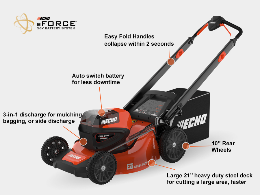 The DLM-2100 push lawn mower, powered by the eFORCE® 56V battery system, delivers hassle-free mowing with legendary ECHO power. With an auto-switch dual-battery dock, three quick-switch clippings discharge settings and a large 21 in. cutting deck, it makes cuts without compromise.