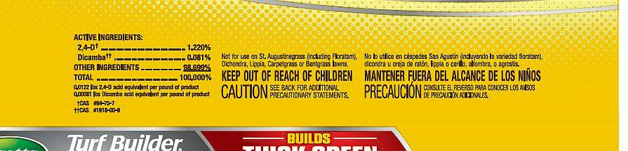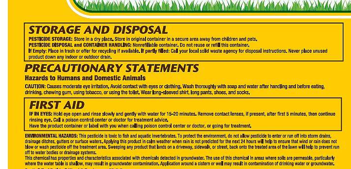 | Precautionary Statement | Not for use on St. Augustinegrass (including Floratam, Dichondra, Lippia, Carpetgrass, or Bentgrass Lawns. KEEP OUT OF REACH OF CHILDREN. Hazards to Humans and Domestic Animals. Environmental Hazards. See package label for extended warnings, directions, and storage & disposal information prior to use. |