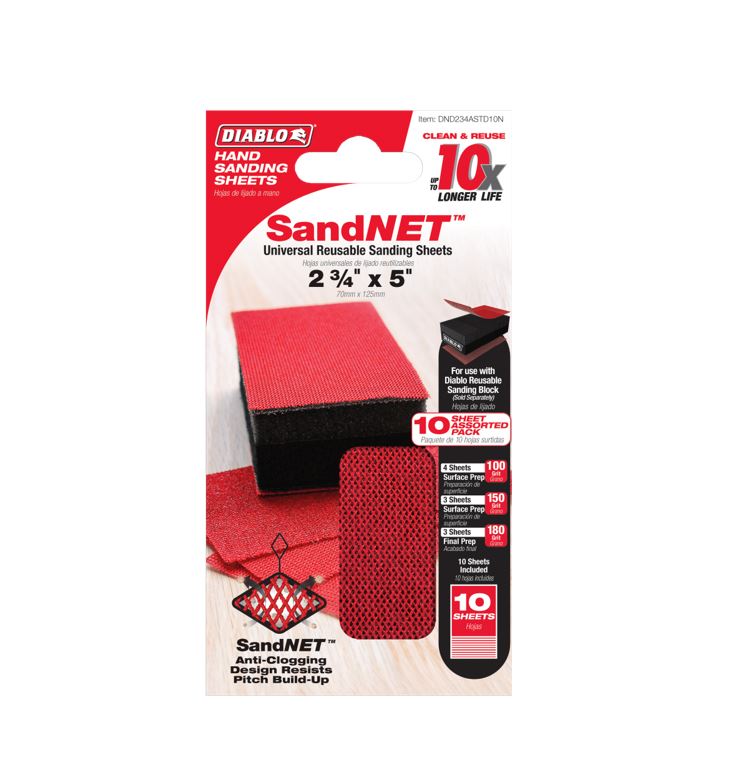 Diablo’s SandNET™ detail sanding sheets with reusable sanding technology are the most advanced sanding sheets on the market with up to 10x longer life versus standard sandpaper. Each SandNET™ sheet features a clog-reducing nylon NET design coated in a premium ceramic blend grit for fast material removal while reducing material build-up. The SandNET™ design is easy to clean and reuse multiple times by simply shaking, vacuuming, or rinsing the sheet to remove any pitch build-up. Compatible with Diablo’s Reusable Sanding Block (DFB234DUOH01G).