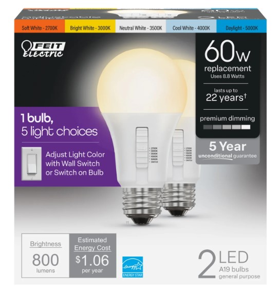 Enjoy all the benefits of advanced LED energy-saving technology with the Feit Electric OM60DM/6WYCA/2 LED color-changing light bulb. This versatile A19 bulb produces 800 lumens of light using just 8.8 watts - up to 85% less than an equivalent 60-watt incandescent. Preset the color temperature with a toggle on the bulb or adjust it after installation with a standard wall switch. Get warm, bright, or cool light any time of day with the flip of a switch. Each bulb has an average life of 25,000 hours/23 years, are RoHS compliant, and are 100% mercury free. Choose a dependable decorative bulb to brighten your home.