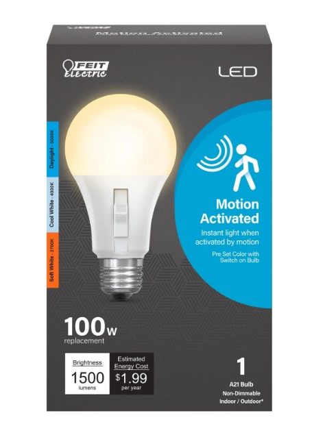 Get the right color light any time of day with the OM100/3CCTCA/MM/LEDI color selectable 100-watt equivalent A19 LED bulb from Feit Electric. Use the toggle on the bulb to select 2700K Soft White, 4000K Cool White, or 5000K Daylight color temperatures. Whether you want to energize your morning, focus on your tasks during the day, or wind down for the night, you can get the right energy saving LED light in any room. any time. Integrated sensors turn this bulb on automatically whenever motion is detected. No additional hardware or special apps required.