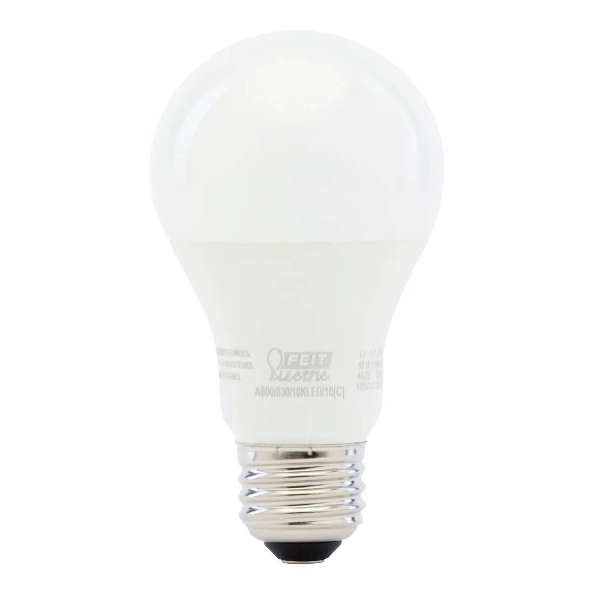 Enjoy all the benefits of advanced LED energy-saving technology with the Feit Electric A800/830/10KLED/24 24-Pack 60W A19 LED Light Bulbs. This 3000K warm white light is non-dimmable and will replace 60-watt equivalent incandescent bulbs. It produces a similar light output (800 lumens), uses 10 watts of energy and up to 83% less energy than a standard incandescent light bulb. Get instant on to full brightness with relatively cool running performance. Feit Electric bulbs have an average life of 11,000 hours/10 years are RoHS compliant and are 100% mercury free. Choose a dependable general purpose bulb for residential or commercial applications.