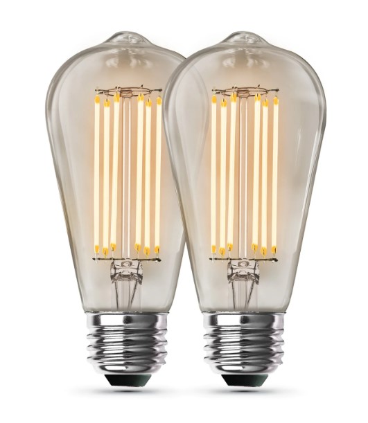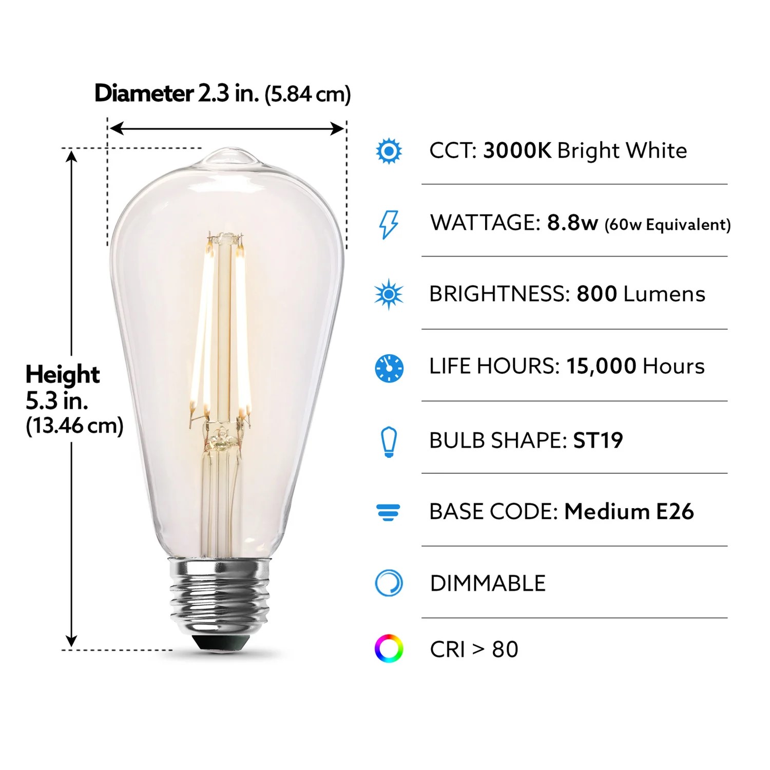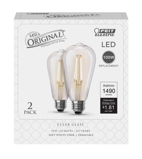 Combine the classic look and feel of glass filament lighting with the advantages of modern LED technology with a two-pack of T19100CL/927CA/2 LED light bulbs from Feit Electric. These elegant ST19 dimmable bulbs produce 1490 lumens of 2700K Soft White light using only 15 watts - up to 85% less than an equivalent 100-watt incandescent. Enhance 90+ CRI makes skin tones more natural and colors vibrant, all while saving energy and lasting 15,000 hours or more. A stylish tapered look with exposed filament wrapped in glass housing is ideal for decorative lighting fixtures and will enhance the décor of any room.