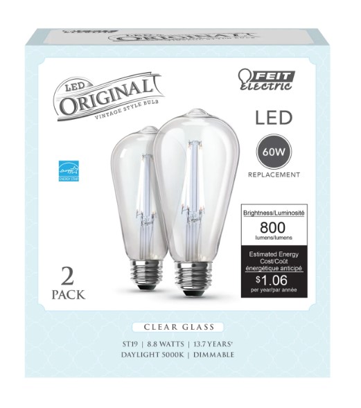 Combine the traditional look and feel of chandelier lighting with the advantages of modern LED technology with ST1960/CL/950CA/2 Original Vintage style LED light bulbs from Feit Electric. Their Daylight 5000K glow provides cool, energizing light ideal in kitchens, dining spaces, and closets. Place these medium base bulbs in pendants and wall sconces with E26 sockets to give your home an ambiance previously only seen in high-end restaurants and hotels. Their dimmable light produces 800 lumens using 8.8 watts of electricity - saving up to 85% in energy costs over an equivalent 60-watt incandescent. A stylish tapered look with an exposed filament wrapped in glass housing is ideal for decorative lighting fixtures and will enhance the décor of any room. Their 90+ CRI color rendering makes skin tones appear more natural and colors more vibrant. Choose long-lasting Feit Electric Original Vintage LEDs for up to 15,000 hours/13 years of even, high-quality light.